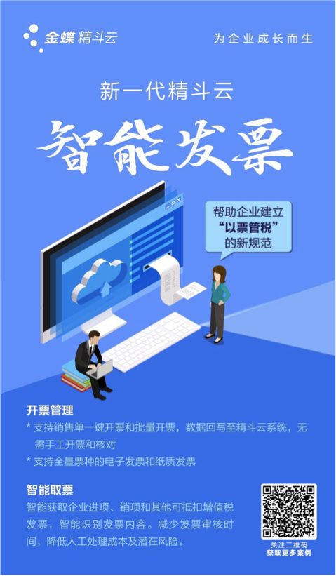 新一代精斗云產(chǎn)品提供業(yè)務(wù)財稅一體化管理解決方案,有效拉通業(yè)務(wù)系統(tǒng)、財務(wù)系統(tǒng)、稅務(wù)系統(tǒng),連接采購、銷售、資金、資產(chǎn)、報銷、發(fā)票、申報等業(yè)務(wù)環(huán)節(jié),實現(xiàn)一鍵開票,且支持全量票種。
