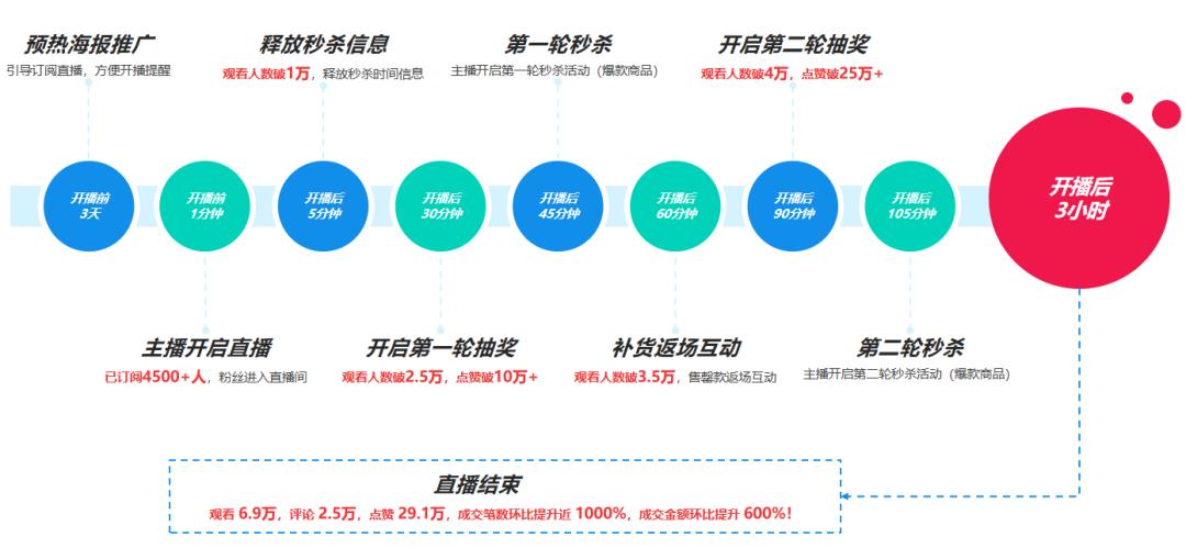 直播之前通過預(yù)熱海報(bào)推廣和積累人氣,引導(dǎo)客群訂閱直播內(nèi)容,方便開播提醒。開啟直播后,已訂閱的用戶超過80%進(jìn)入直播間;通過爆款商品,吸引更多的客戶進(jìn)去直播間,觀看人數(shù)迅速突破1萬人;開啟第一輪抽獎(jiǎng),觀看人數(shù)破2.5萬,點(diǎn)贊破10萬+;補(bǔ)貨返場互動(dòng),觀看人數(shù)破3.5萬,售罄款返場互動(dòng);開啟第二輪抽獎(jiǎng),觀看人數(shù)破4萬,點(diǎn)贊破25萬+;第二輪秒殺,主播開啟第二輪秒殺活動(dòng)(爆款商品)……