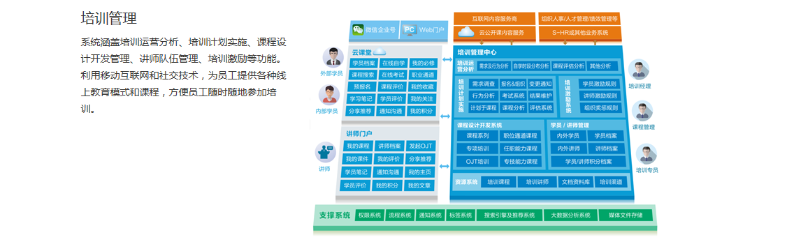 支持企業(yè)人才發(fā)展戰(zhàn)略,幫助企業(yè)構(gòu)建科學(xué)、規(guī)范、全面的員工培養(yǎng)體系。系統(tǒng)涵蓋培訓(xùn)運營分析、培訓(xùn)計劃實施、課程設(shè)計開發(fā)管理、講師隊伍管理、培訓(xùn)激勵等功能,貫穿培訓(xùn)管理全過程。系統(tǒng)充分利用移動互聯(lián)網(wǎng)和社交技術(shù),延伸拓展培訓(xùn)空間和時間,提供各種線上教育模式和課程,方便員工隨時隨地參加培訓(xùn),及時獲得企業(yè)和崗位所要求掌握的各項知識和技能。